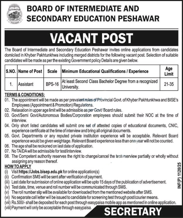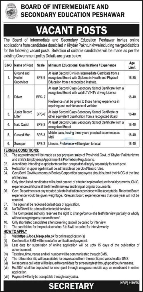 The appointment will be made as per prevalent rules of the Provincial Govt. of Khyber Pakhtunkhwa and BISE’s Employees (Appointment & Promotion) Regulations.