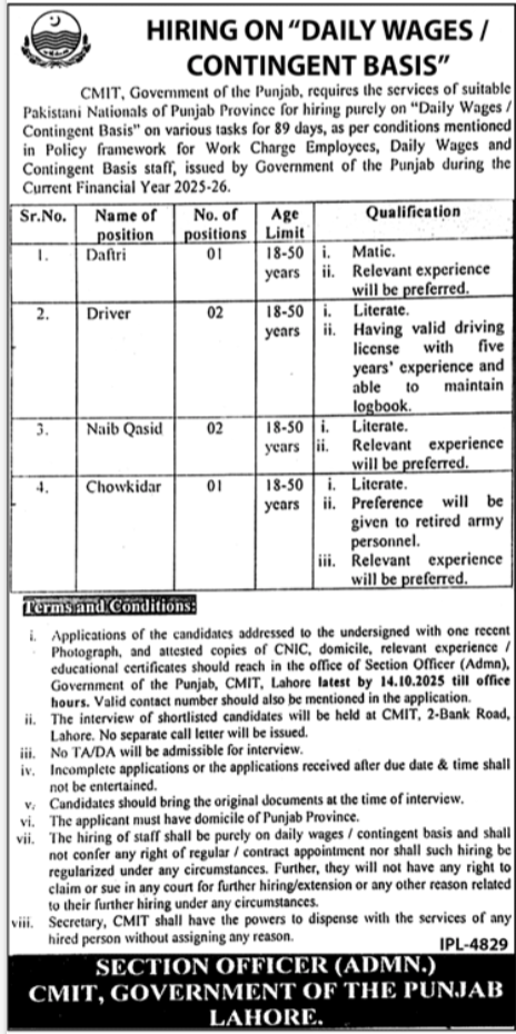 - Applications along with recent photographs, attested copies of CNIC, domicile, experience/educational certificates must reach the Office of Section Officer (Admin), CMIT, 2-Bank Road, Lahore by 14 October 2025.