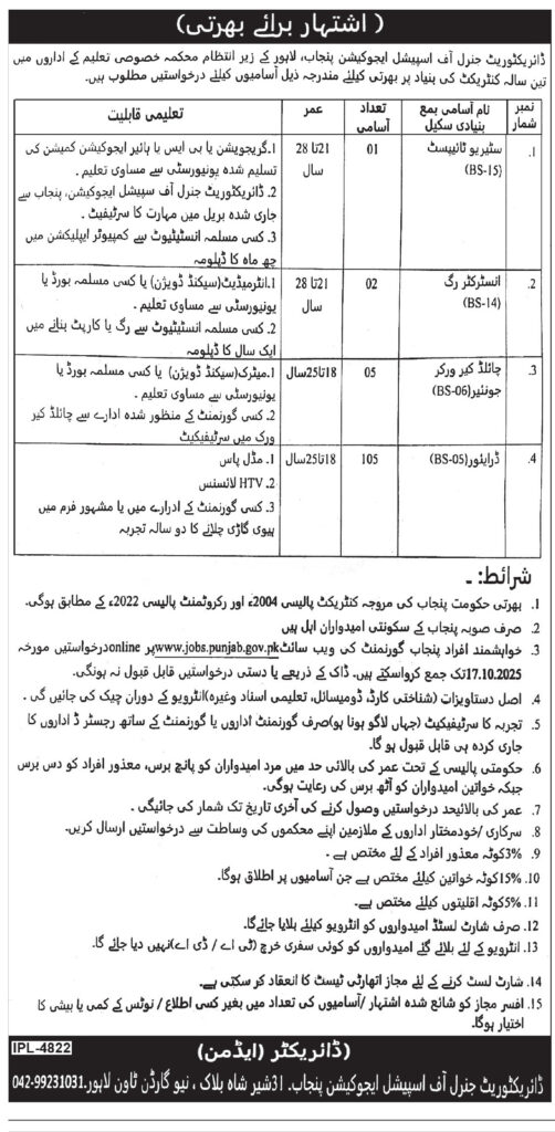 The Directorate General of Special Education, Punjab (Lahore) has announced multiple job vacancies under the Special Education Department on a three-year contract basis. Applications are invited from eligible candidates (Punjab domicile holders) for different teaching, technical, and driving positions.