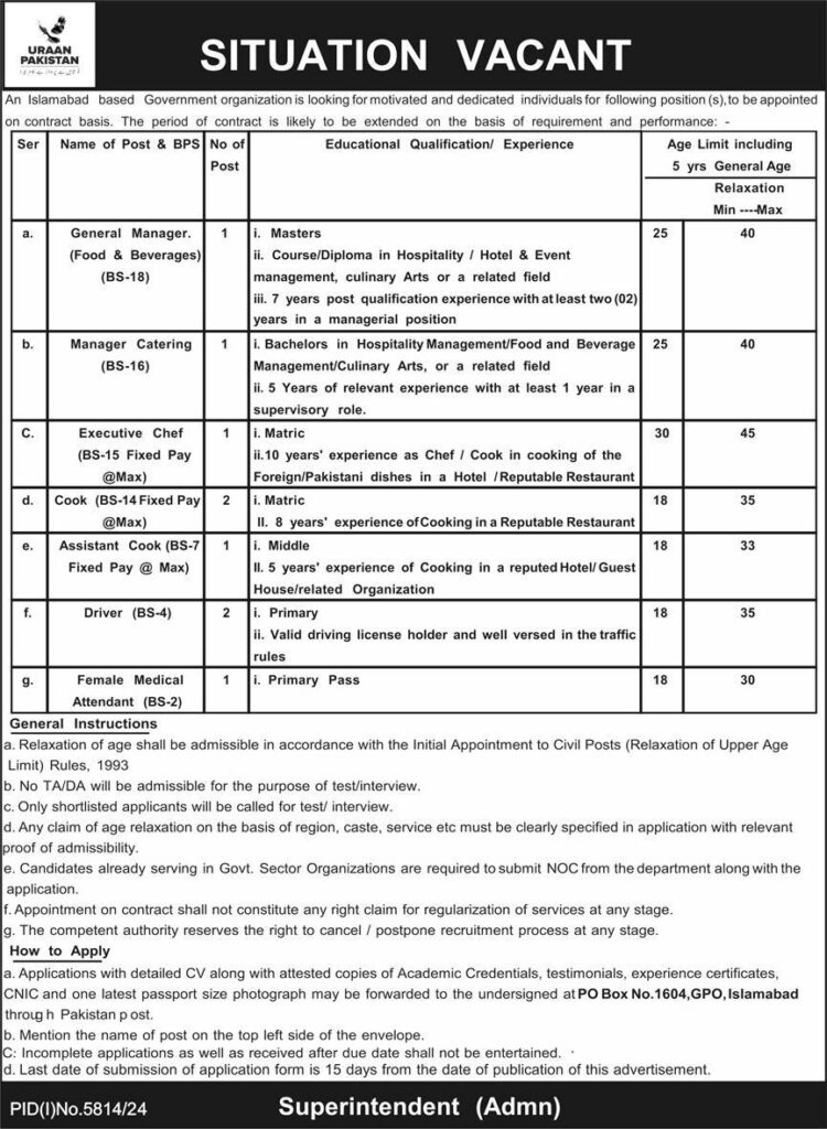 An Islamabad-based Government Organization is inviting applications for multiple positions in the Food & Beverage Department on a contract basis. The contract is likely to be extended based on performance and organizational requirements. The positions include General Manager (Food & Beverages), Manager Catering, Executive Chef, Cook, Assistant Cook, Driver, and Female Medical Attendant.