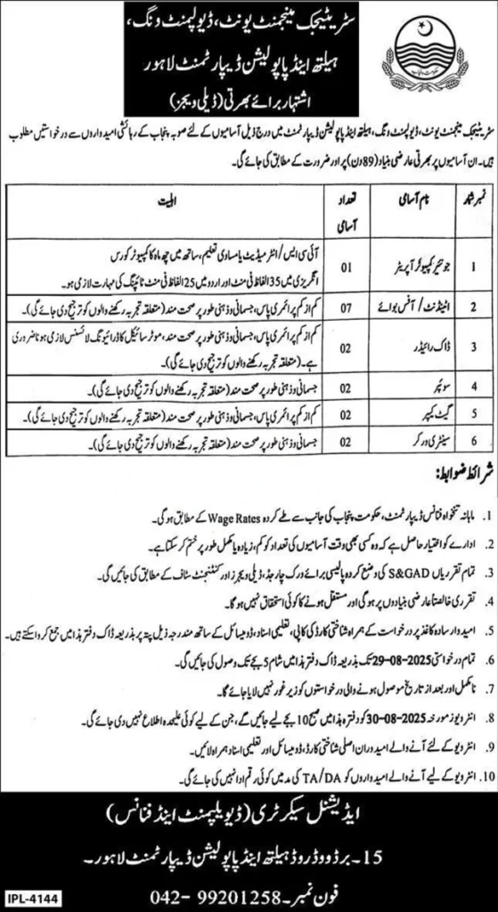 Central Management Unit — Housing & Public Health Engineering Department, Lahore is engaging daily-wage/temporary staff for office support at 15-Birdwood Road, Lahore, with hiring aligned to Punjab Wage Rates and current S&GAD instructions; candidates should file a simple application with copies of credentials by 29-08-2025 and appear for the walk-in interview on 30-08-2025 at 10:00 AM with original documents, noting that contracts are short term and may close early based on office needs; queries can be directed to 042-99201258.