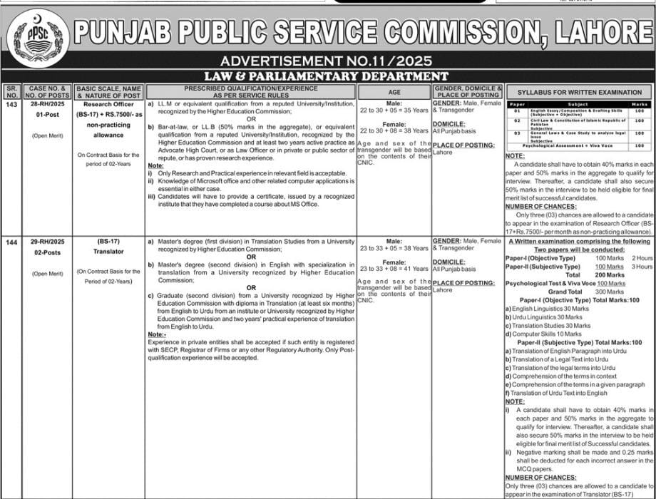 The Punjab Public Service Commission (PPSC) has announced multiple vacancies across various government departments in Punjab. This is an excellent opportunity for law professionals, translators, researchers, and administrative staff looking to build a career in the public sector. If you’re looking for a secure, merit-based government job, this is your chance to apply.