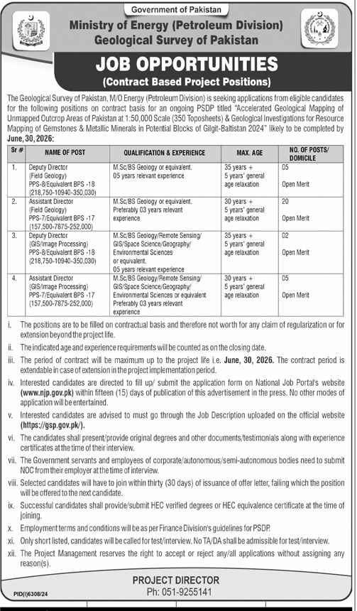 The Geological Survey of Pakistan (GSP), under the Ministry of Energy (Petroleum Division), is inviting applications from highly motivated professionals for multiple contract-based positions under the PSDP project titled “Accelerated Geological Mapping of Unmapped Outcrop Areas of Pakistan at 1:50,000 Scale (350 Toposheets) & Geological Investigations for Resource Mapping of Gemstones & Metallic Minerals in Potential Blocks of Gilgit-Baltistan 2024.”
