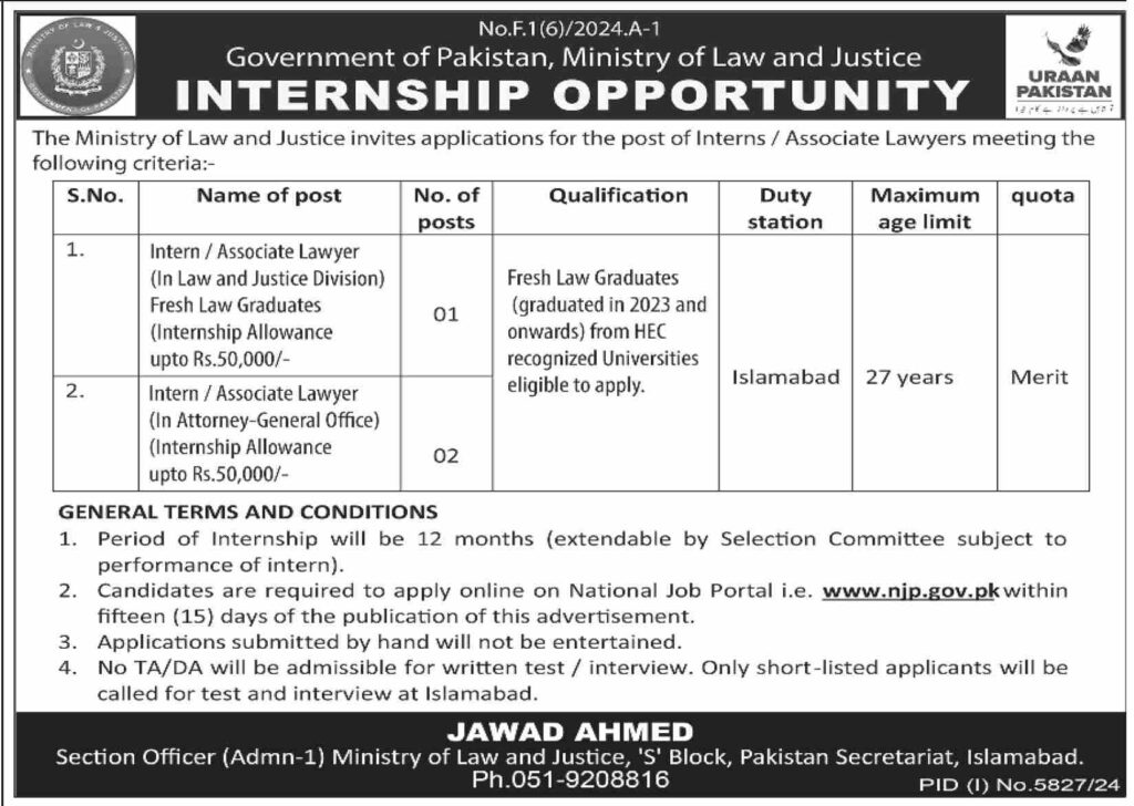 The Ministry of Law and Justice, Government of Pakistan is offering a remarkable opportunity for Fresh Law Graduates through its Internship Program for the position of Intern/Associate Lawyer. This government internship is based in Islamabad and is available in two distinguished divisions: Law and Justice Division and the Attorney-General Office. The internship program is designed to provide practical legal experience and exposure to real-world legal procedures, policy-making, and legislative matters. It is an ideal opportunity for aspiring lawyers to learn from seasoned legal professionals and enhance their legal skills.