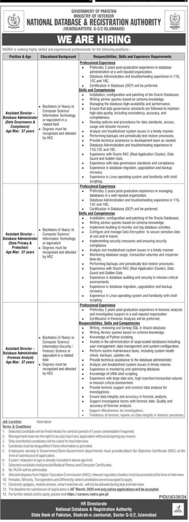 The National Database & Registration Authority (NADRA) is hiring highly skilled and experienced professionals for key database administration and forensic analysis roles. This is a unique opportunity to contribute to Pakistan’s digital transformation while working in a secure and technologically advanced environment.