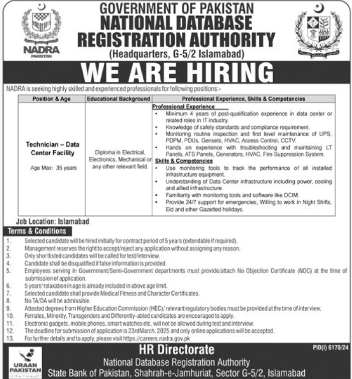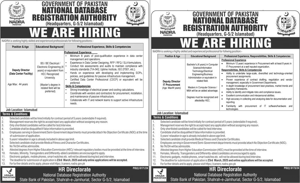 The National Database and Registration Authority (NADRA), Government of Pakistan, is hiring highly skilled and experienced professionals for two key positions: Deputy Director (Data Center Facility) and Deputy Director (IT Procurement). These positions offer competitive salaries, career growth, and the opportunity to work in a leading government organization that manages Pakistan’s digital identity and security infrastructure.