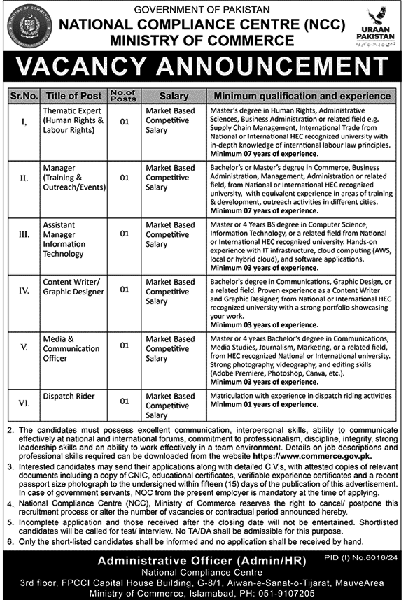 📍 Administrative Officer (Admin/HR), National Compliance Centre (NCC), 3rd Floor, FPCCI Capital House Building, G-8/1, Aiwan-e-Sanat-o-Tijarat, Mauve Area, Islamabad.