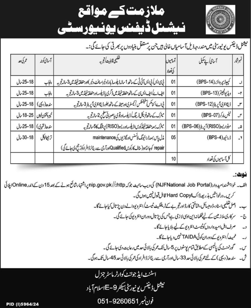 National Defence University (NDU), Islamabad, invites applications from qualified and experienced professionals for permanent positions in multiple departments. Openings are available for Computer Supervisor, Data Entry Operator, Video Engineer, Driver, and RISO roles. Candidates from Punjab and Balochistan are encouraged to apply. These government jobs come with stable career growth, competitive salaries, and a chance to work in one of Pakistan’s most prestigious academic institutions.