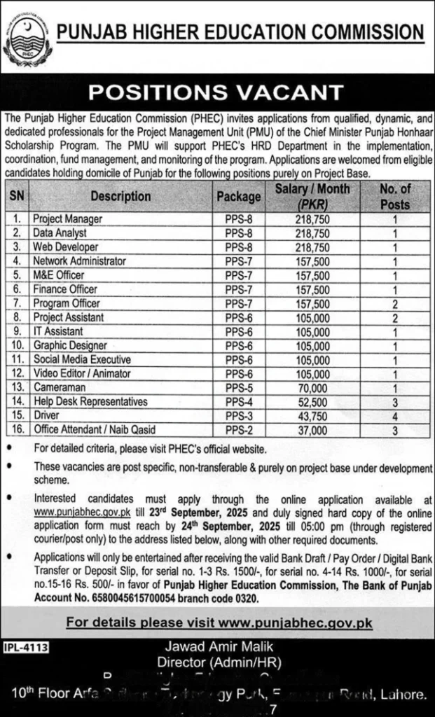 Posts span program leadership and operations—Project Manager, Data Analyst, Web Developer, Network Administrator, M&E and Finance Officers, Program/Project/IT Assistants, Graphic Designer, Social Media Executive, Video Editor/Animator, Cameraman, Help Desk Representatives, Drivers, and Office Attendant/Naib Qasid—with **PPS-8 at PKR 218,750/month, **PPS-7 at PKR 157,500, **PPS-6 at PKR 105,000, **PPS-5 at PKR 70,000, **PPS-4 at PKR 52,500, **PPS-3 at PKR 43,750, and **PPS-2 at PKR 37,000 (final eligibility and age/experience will be confirmed on the PHEC site). This notice is optimized for quick “PHEC jobs 2025 apply online” answers: location—Lahore, project—Honhaar Scholarship PMU, hiring basis—PPS, and deadlines—23/24 September 2025.