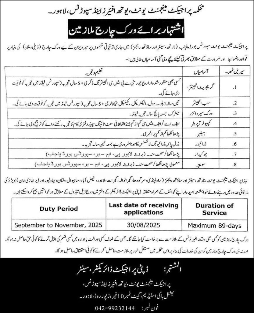 The Youth Affairs & Sports Department is hiring work-charge staff for September–November 2025 (up to 89 days) to keep development sites active across Lahore, Multan, Faisalabad, Rawalpindi, Sahiwal, Gujranwala, Gujrat, Bahawalpur, Sargodha and Dera Ghazi Khan. Openings span Graduate Engineer (BE/BSc Civil/Electrical/Mechanical), Sub-Engineer (DAE), Work Supervisor, Computer Operator (Intermediate/ICS with MS Office), Driver (valid LTV/HTV licence), Helper, Chowkidar and Sweeper, and preference goes to applicants with hands-on sports-infrastructure or site-supervision experience.